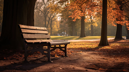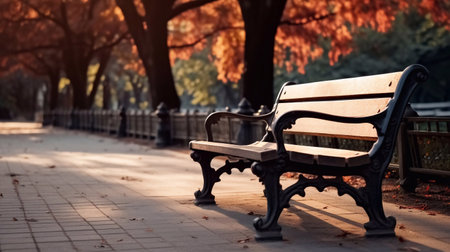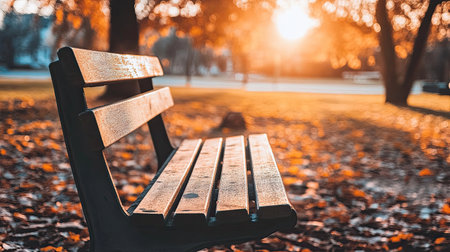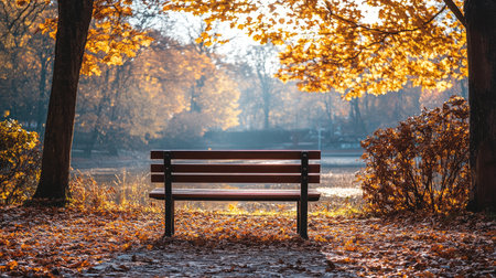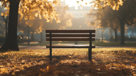 A serene park bench sits under a golden sun, surrounded by vibrant autumn leaves, creating a peaceful atmosphere perfect for reflection and relaxation.