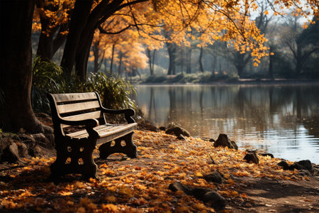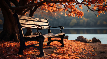 A solitary bench surrounded by vibrant autumn leaves at sunset in a tranquil park setting. Generative AI