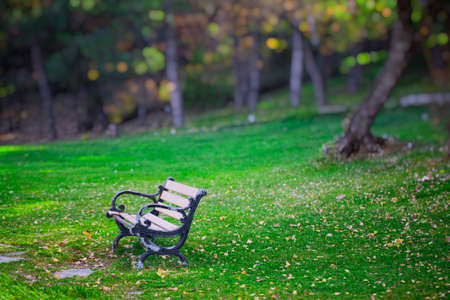Bench in the park. Autumn season. Selective focus. Toned.