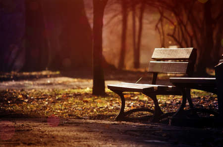 Bench in the park in the morning. Autumn season, fall.