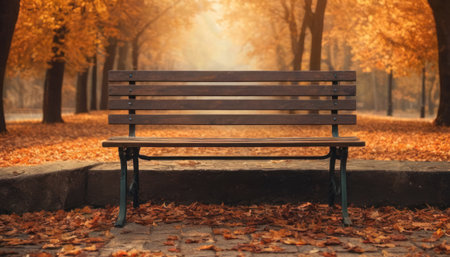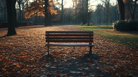 An empty park bench surrounded by autumn leaves and bathed in golden light, representing solitude, peacefulness, and the beauty of nature during fall.
