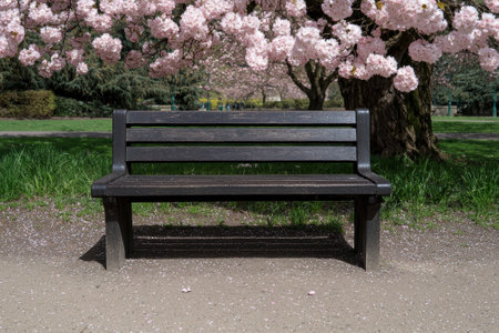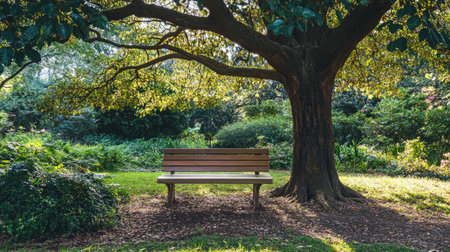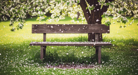 A peaceful image of a lone park bench nestled among blooming trees and lush greenery,