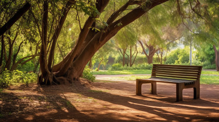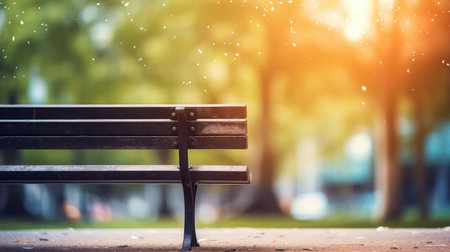 shot of an empty park bench at sunset, created with generative ai