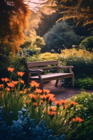 Wooden bench in the beautiful garden at sunset. Vintage style.
