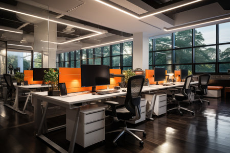 Modern coworking office interior with orange and white computer tables and chairs