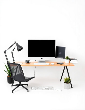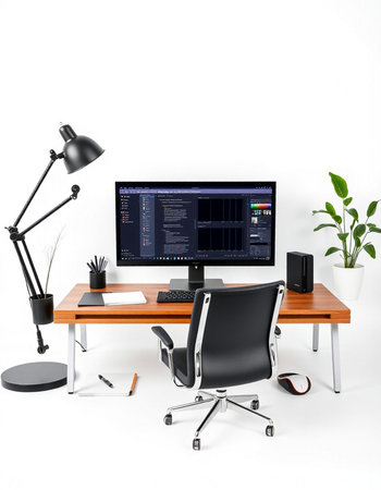 Workplace with computer on table, lamp and plant on white background