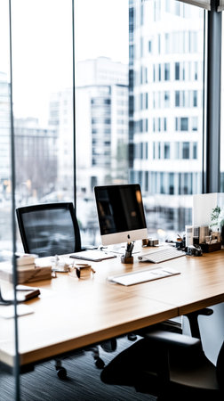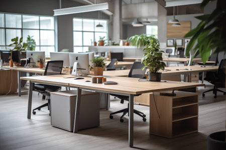 Modern office space with tables and chairs, computers and office supplies with no employees