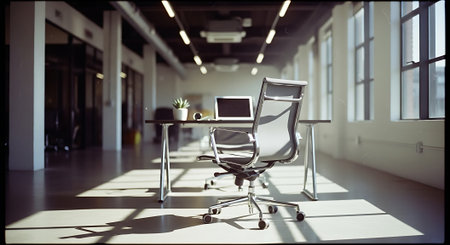 A bright, empty office with a desk, laptop, and chair. Sunlight streams through large windows, casting shadows on the polished floor.