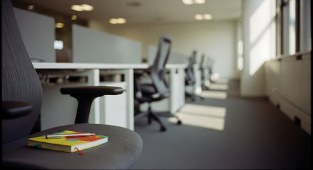 A modern office space featuring rows of cubicles with desks, chairs, and a colorful book on a table.
