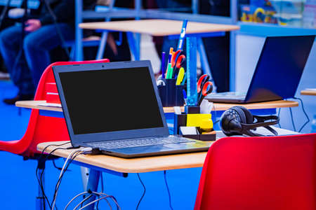laptop on a school desk. Computer in an educational center. Center for training specialists. Classroom in a modern school. Place for the student. laptop on the office desk. Education.