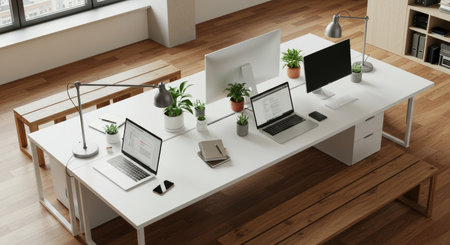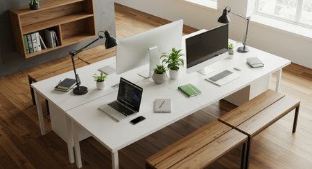 Top view of modern open space office with white walls, wooden floor, white computer tables with laptops and gadgets. 3d rendering
