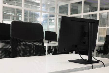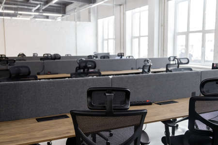 Modern bright open space office interior with computers and equipment. Nobody inside