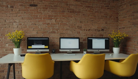 A vibrant and modern office space featuring yellow desks and computers, designed for productivity and collaboration in a creative work environment.