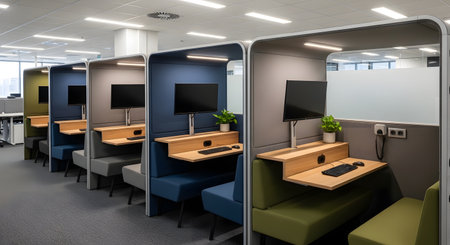 A modern open-plan office space featuring a row of soundproof work pods with desks and monitors. The clean contemporary design emphasizes privacy and productivity within a collaborative environment.