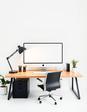 Modern workplace with computer, lamp and other items. Workplace concept