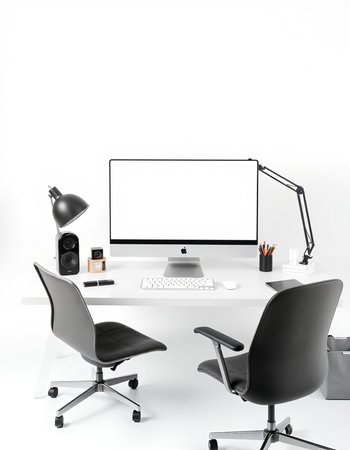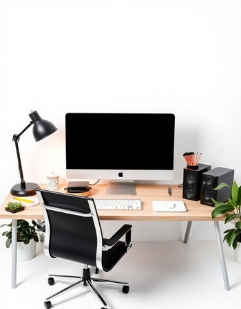 workplace with computer and black chair on white background