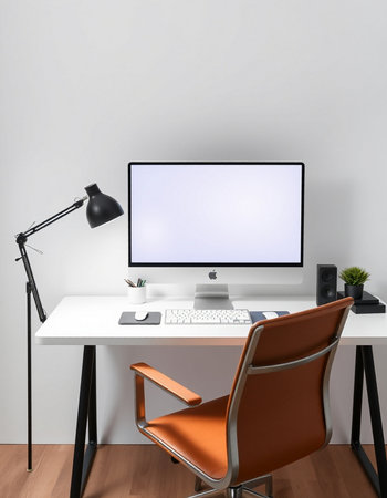 Modern workplace with computer on desk and lamp on white wall, stock photo