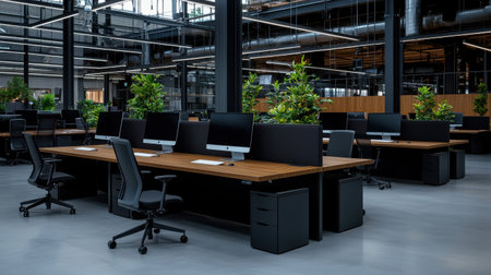 Rows of computers line an empty office space, highlighting the stark, modern workspace. Focus on technology and business environment.