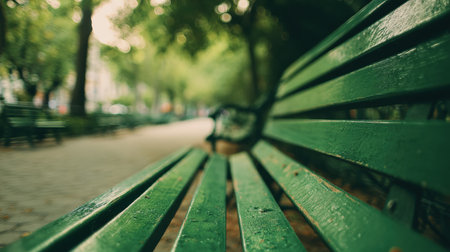 close up of green wooden bench in urban park during sunset time