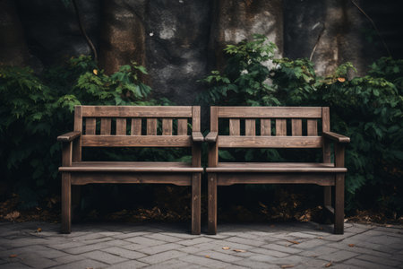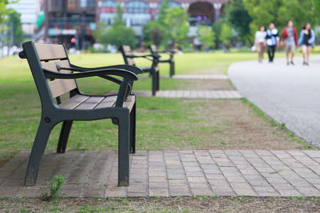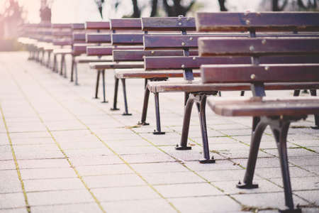 Empty park benches stand in a row. Old wooden benches in a park. Seat and unwind area. Space for text, Selective focus.