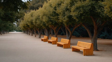 A peaceful park path features several wooden benches lined beneath lush trees, creating a tranquil atmosphere for relaxation and enjoying nature's beauty.