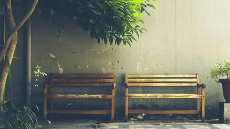 Row of empty wooden benches under tropical palm along yellow wall in vertical format, peaceful outdoor setting ideal for relaxation, waiting area or urban design background