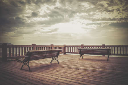 Wooden benches in a viewpoint to enjoy the sunset in a relaxed way