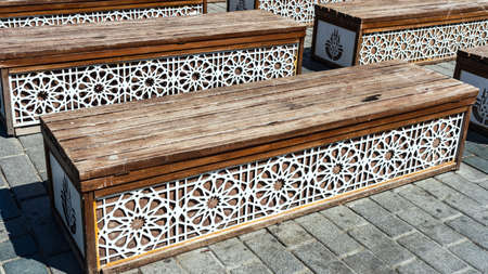 Wooden benches with Istanbul city emblem in front of Blue Mosque - Sultanahmet, Istanbul, Turkey