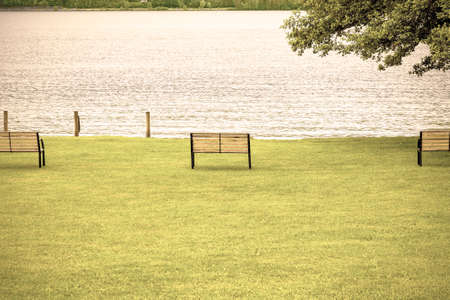 Rain and morning mist on the Wolfgangsee in Austria. Small well-kept park with benches on a lawn near a lake in Austrian rural landscape. Vintage style