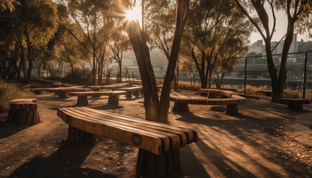 Tranquil sunset bench in a peaceful forest with autumn leaves generated by artificial intelligence