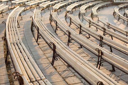 Empty park benches rows in front of an open air stage. Bulgaria, Bourgas, Sea Garden.