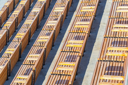 Row of wooden benches at summer theater in a city park.