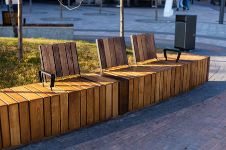 Wooden benches in the city center. Comfortable brown benches in the city. Wooden benches in old town in summer sunny day.