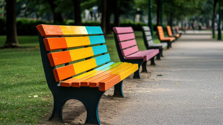 Colorful benches in the park. Selective focus and shallow depth of field.