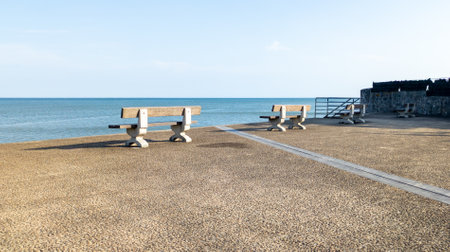 Benches on the Rockaways Boardwalk and view of the beach, in Queens, New York City