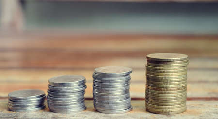 Stacks of coins on wooden table with blurred background, business growth concept