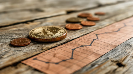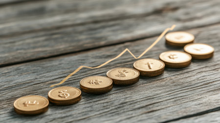 A collection of golden coins arranged in line, symbolizing financial growth with a rising trend graph, showcasing investment potential on a textured wooden background.