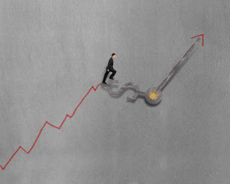 Walking on money symbol clock hands with growing red arrow