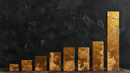 A striking golden bar graph set against a dark background, symbolizing financial growth and success. This visual representation is ideal for financial and business concepts.
