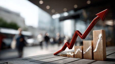 This image showcases a business growth concept featuring a wooden bar graph and an upward arrow against an urban backdrop, symbolizing financial success.