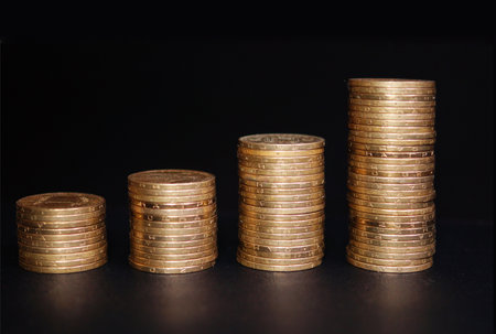 Stacks of coins in a growing progression. Background with copy space for text or inscriptions. Business economic development concept