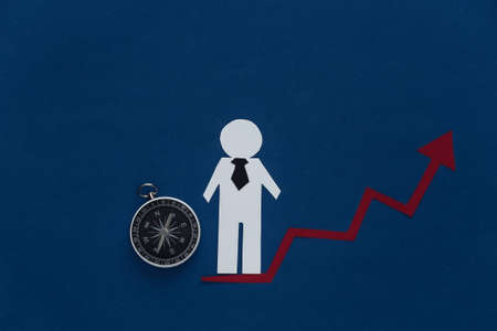 Miniature people on top of dollar banknotes with financial graph and compass.