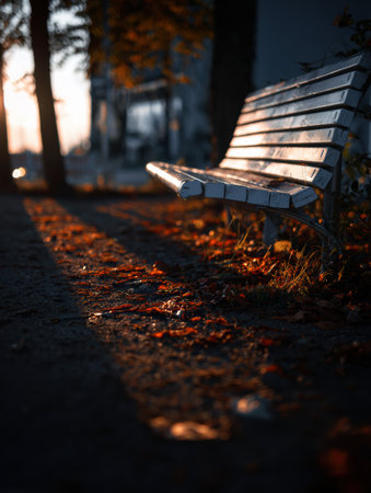 A solitary bench rests in soft sunset glow, casting long shadows on fallen leaves. The peaceful atmosphere invites quiet contemplation and nostalgia.