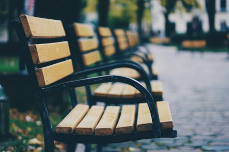 Modern wooden benches standing on the sides of the paved paths of the city park on a rainy day.