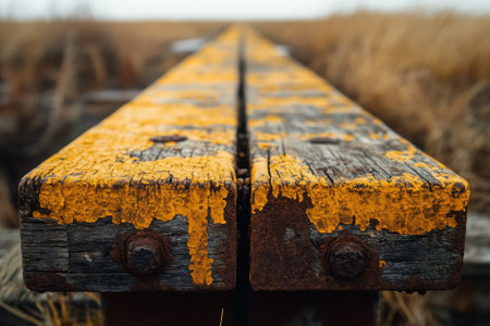 Closeup of a weathered wooden walkway with peeling yellow paint.