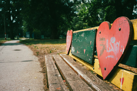 Decorated park bench in the daytime, hearts as ornaments and green writing board.
