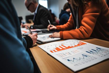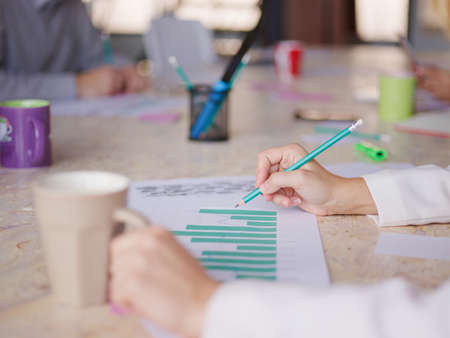 Businesspeople analyzing paper reports with diagrams. Business team standing at table, looking and pointing at documents. Closeup shot of table and hands. Analysis and teamwork concept