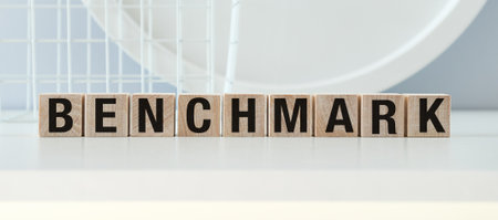 On a light background, wooden cubes and a wooden block with the text BENCHMARK. View from above