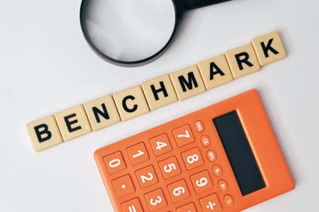 Top view of calculator, magnifying glass and square letters with text BENCHMARK over white background.