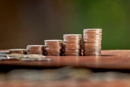 Stacks of money coins in ascending order. Financial success chart for profit strategy planning.